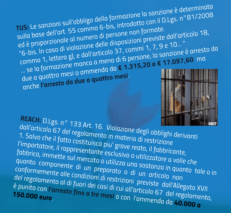 Vale la pena ricordare il sistema sanzionatorio sia lato TUS, che REACH. Il secondo tocca tutti gli ambiti della filiera dal fabbricante all’utilizzatore lavoratore autonomo (anche piccolo artigiano).